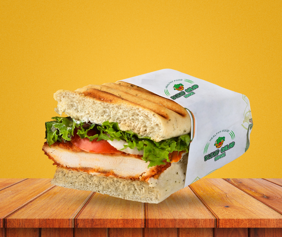 Pan tipo pannini, pechuga de pollo natural empanizada bañada en salsa alitas, cebolla, tomate y lechuga.