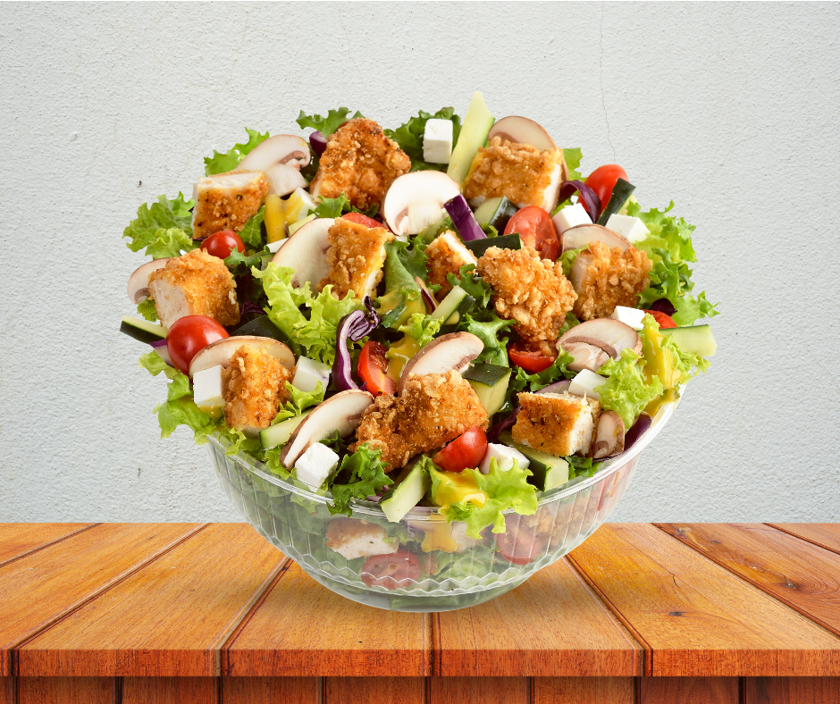 €5 porciones de barra fría a elegir + 2 porciones de pollo a elegir. Aderezo a elección. Tiras o croutones. $229